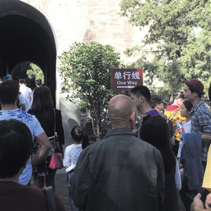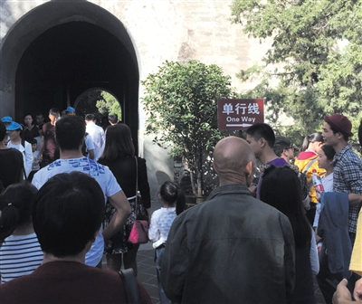 昨日,游客对颐和园文昌阁下的“单行线”引导标识熟视无睹,门洞内形成密集的双向人流。