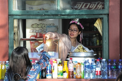 10月2日,北海公园,一名游客在购买烤香肠。该公园内设有小吃店、餐厅,各种价位均有。本版摄影/新京报记者 彭子洋