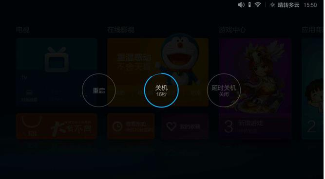 接下来就是关机,那么重点来了,可能在关机的时候你和开机一样,简单的按一下遥控器左上角的红色开关键,小米电视2S会黑屏,像是进入了关机状态。其实这个时候不是真正意义上的关机,而是待机,某些程序仍可以在后台运行。可以这么说吧,只要是你之前打开的软件,或者是后台自起的软件,都会在小米电视2S的后台继续运行,其目的就是让你在进入此应用的时候,获得比较快的速度,从而缩短等待时间。如果在你关闭电视前正在看电影,那么当你重新打开电视即可恢复到待机前的电视画面。长按遥控器的电源键(1秒以上),小米电视2S上会弹出功能菜单,可选择“关机”、“重启”和“延时关机”。这时候你选择关机才是真正意义上的关闭小米电视,那么无论你后台运行什么样的软件都会随着切断电源而真正的关闭。