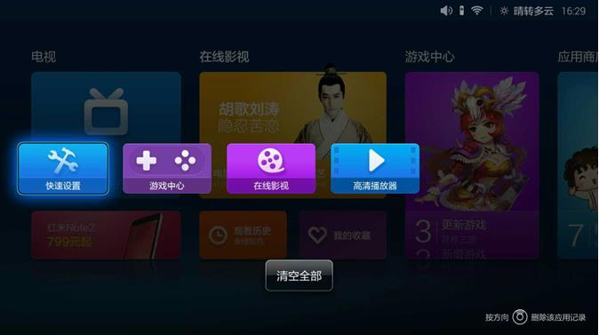这个时候会出现你打开过的应用程序,例如高清播放器、在线影视、游戏中心、快速设置,可以选择清空全部,也可以选择清除其中的几个。屏幕的右下角有提示,按方向删除该应用记录。比如想删除快速设置应用程序,选定快速设置应用程序之后,按一下遥控器上的方向键上,快速设置应用程序就被删除了。