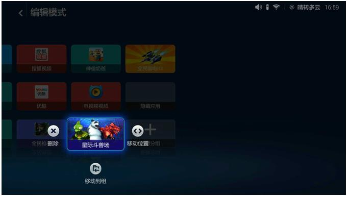 接下来常按(1秒钟以上)遥控器上的确认键(方向键中间的那个圆按键),会直接出现删除,移动位置,还有移动到组三个选项,想要进行什么操作和上面所说的一样。这样操作的好处是省略了一个步骤,可以直接对图标进行整理,不用进入到编辑模式。