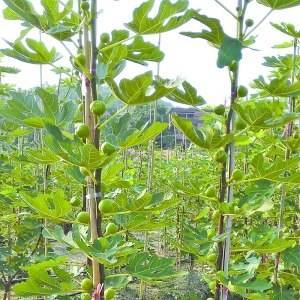 无花果采用扦插法,刚开始时扦插苗只有底部有根,露在地面都是黑黑的,活像一根根柴火棍插在那里。直到两三个月后,棍子抽了新枝条和叶子,大伙才终于放下心来。
