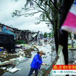 罗边村是整个龙卷风肆虐的重灾区。实发市场外一位被叫来清理杂物的师傅对记者说,前天龙卷风从余荫山房一直往西北方向刮来,前后大约持续了5分钟。这短短的5分钟,实发市场里的景象就像被轰炸过一般:一大半简易的防雨棚已经被撕得没有一片完整的,有的钢架直接砸到了停放在下面的三轮车,地上仿佛被洗劫过,满地都是垃圾和杂物。