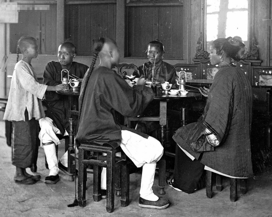 09 茶楼其实开创有两百多年了,最早的时候未必有东西吃,只是专门品茶。这间广州的茶室就是当时人们消闲之地。见外国人来拍照,茶客还显得拘谨。