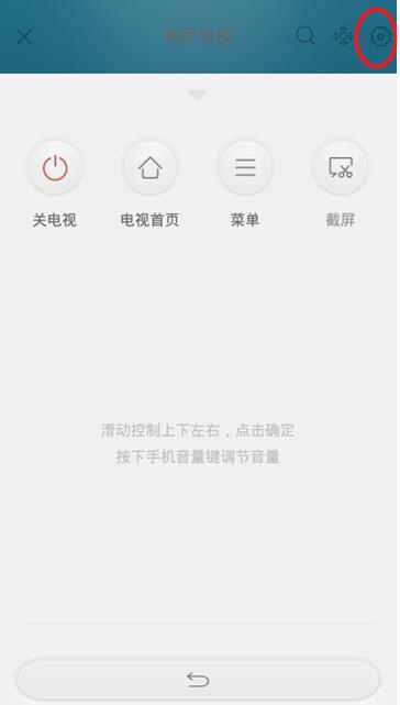 然后点击客厅电视,进入到遥控器界面。现在重点来了,注意右上角,有一个设置的图标,我用红色圆圈标注出来的,点击这个图标。