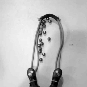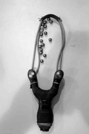 记者看到,马某使用的是Y形弹弓,木制,长约15厘米,木柄用黑色胶带缠绕,橡皮绳,弹珠是直径8毫米左右的钢珠。