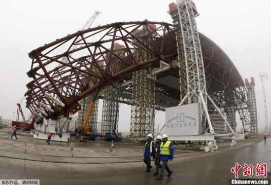当地时间11月27日,乌克兰切尔诺贝利核电站新防护罩安装工程进行中。据悉,这一新防护罩建设预计将花费13.1亿美元,将于2015年正式完工。1986年4月26日切尔诺贝利核电站爆炸事故被认为是核发电历史上最严重的事故。