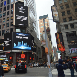纽约时代广场素有“世界的十字路口”之誉,其户外大屏广告被称为世界顶级品牌秀场,是“最吸引全球目光”的最佳窗口之一。2011年胡锦涛主席对美国正式访问期间,中国国家形象片就曾同期在纽约时代广场播放,令世界广泛关注。