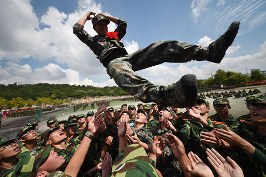 9月10日,南京财经大学12名大学生新兵穿上军装、戴上红花,在同学和老师的簇拥欢送下,奔赴军营。CFP供图