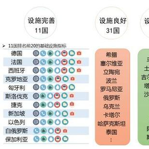 11国基础设施完善,除新加坡、以色列外均为欧洲国家;31国基础设施基本良好,仍以东、南欧国家为主。中亚、中东地区等10国基础设施处于中等水平。南亚、东南亚和非洲沿线国家基础设施较为薄弱。
