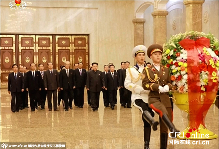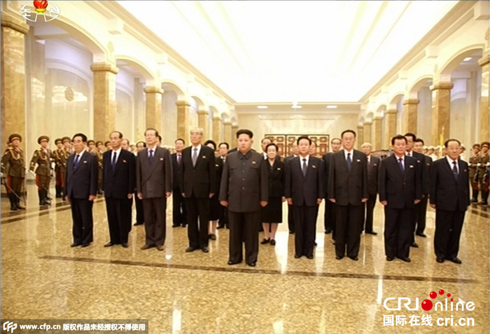 当地时间2015年10月10日,朝鲜劳动党成立70周年之际,朝鲜最高领导人金正恩10日零时前往锦绣山太阳宫,向金日成和金正日表示崇高敬意。金己男、崔龙海、崔泰福、金养建、郭范基、吴秀容、金平海等陪同前往。图片来源:CFP