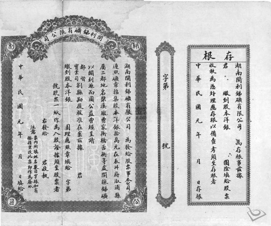 在各大拍卖网站上,能搜索到一张八成新的“湖南开利锑矿有限公司股票”图片,对民国金融历史颇有研究的著名财经作家、《德林爆语》主持人、万有新媒创始人李德林判断,这应该是湖南民国第一股。不过其上面空白,没有填写文字事项,这张股票背后有着什么样的故事,隔着历史的尘埃,现或难以而知。