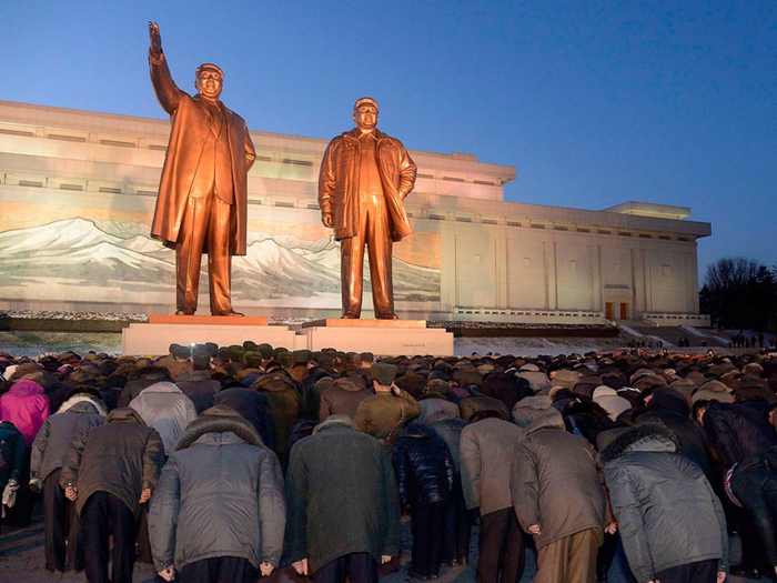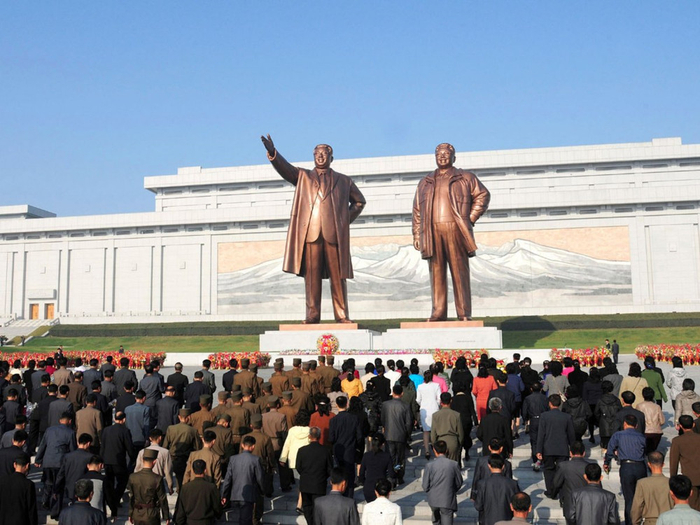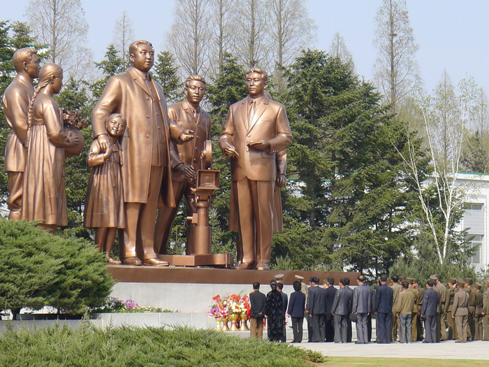 万寿台纪念碑,那里耸立着金日成的青铜雕像。金日成在1972年到1994年间担任朝鲜最高领导人,他旁边是其继任者金正日。(网页截图)