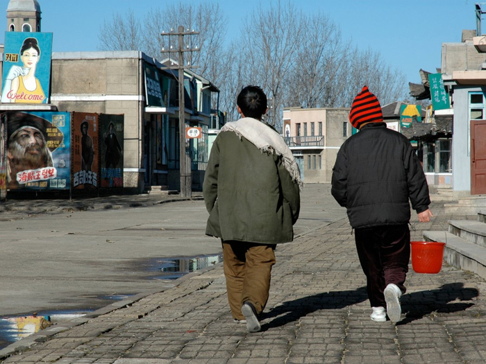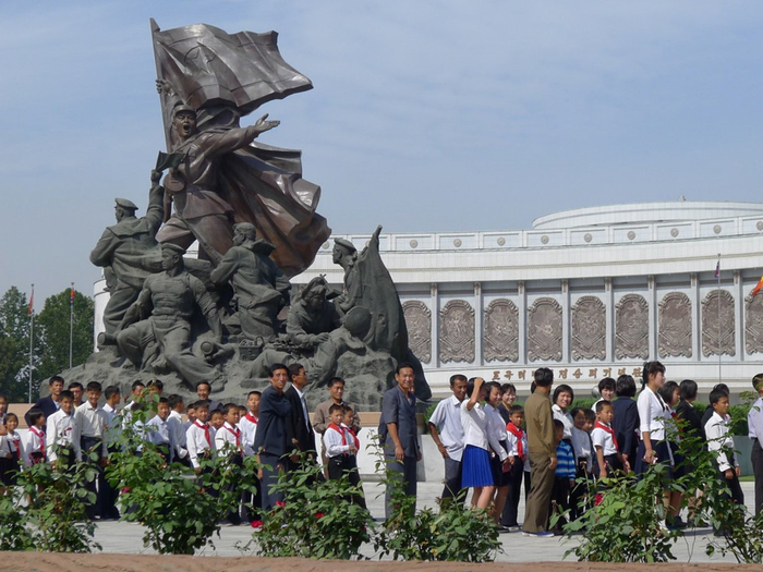 朝鲜著名电影《卖花姑娘》1972年上映,由于该电影太过知名,影视城内雕刻了金日成与剧组人员站在一起的青铜雕像。(网页截图)