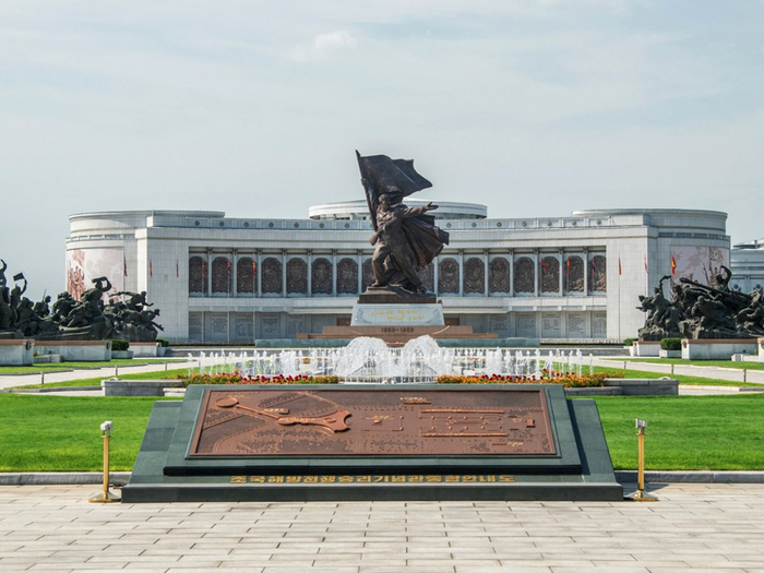 战争博物馆两侧的两个青铜雕像,分别纪念朝鲜在陆地和海洋上取得的战斗胜利。(网页截图)