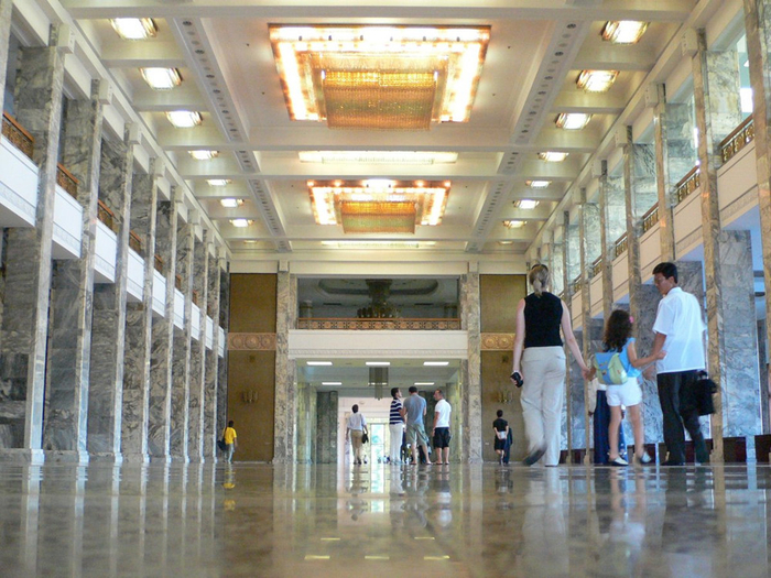 朝鲜人民大会堂内部巨大的花岗岩石柱和华丽的头顶灯(网页截图)