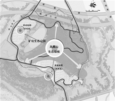 这份规划最让人眼前一亮的是,如今荒废的矿山未来将建成工矿修复主题的郊野生态公园及高端养老社区。本次规划形成“一核、一园、一环、两组团、多视廓”的空间结构。一核为凤凰山生态绿核,一园是矿坑生态公园,一环即沿山开成一个道路环,两组团为规划形成两个养老组团,多视廓指在主要组团与凤凰山之间形成多个空间景观视廓。