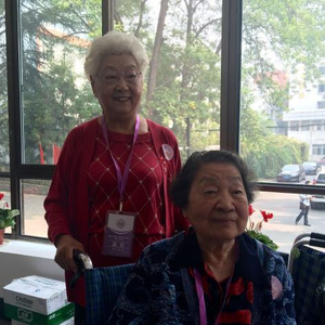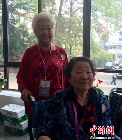 90岁的骆明仁是今天到场年纪最大校友1949年毕业于金陵女子大学,她坐在轮椅上,而身后推着轮椅的王逑今年84岁,是骆明仁的学生,同样也是金陵女子大学的校友。
