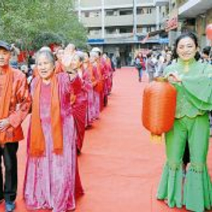 11对老人排成一列,每组先后相差五六步,肩并肩逐一出场。打头阵的是65岁的李通莲和67岁的老伴徐长魁。她挽着他,脸上洋溢着笑容,颇有明星范儿地和街坊邻居挥手,两侧各有三名舞蹈队员“绿叶”般衬托着。