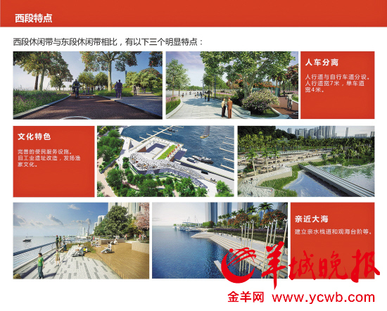 与其他休闲带不同,西段休闲带有三大亮点:一是人车分离,自行车道与人行步道完全分隔,人行道宽达7米,自行车道宽4米,其间以绿化带隔离,人车拥挤乃至自行车撞人事件可以完全避免;其次是滨海长廊的人文关怀气息浓厚,保留了旧工业遗迹和渔村传统。例如即将拆除的东角头油气库,将在滨海栈道中保留输油管道,展现传统工业遗迹;东角头渔人码头,仍然保留渔船码头功能,在市民漫步海滨的时候,仍能欣赏到渔民出海捕鱼以及鱼市交易的风景。西段休闲带更加亲近大海,除了人行道紧邻海滨,更有一段3米宽的二级步道(由原来的边防巡逻道改造而成),比人行道下降1米,更加亲近海湾。