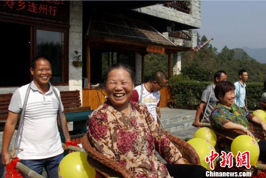 中新网清远10月19日电 (李凌 徐伟跃)“我今年已经60多岁了,第一次享受这么高的待遇,坐了一回轿子,感觉很幸福。”19日临近重阳节,中国长寿之乡广东连州在该市地下河景区举办敬老节,推出“让父母坐一回土轿子”的祈福活动,被女儿女婿抬着坐在轿子中的刘大妈开心不已。