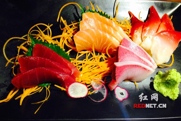 刺身是顾客自选品种拼盘的,每单份是6片,可叫半份。这家店的刺身确实新鲜,据说和长沙几家逼格日料是同一供货商,品质有保证,不过最让我惊艳的是店里自磨的芥末,选用新鲜根磨制而成,口感粗粗的,味道一点也不冲,搭配各种刺身真是一口一个美味啊。