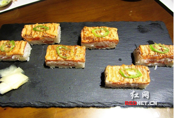 作为传统日料的经典之作,押箱寿司在长沙可真是难得一见,是这家店的特色料理。这道押箱寿司看似简单,实则要花费较为繁杂的工艺,上下两层调味寿司饭中夹着一层三文鱼生,顶部选用的是从加拿大进口的野生三文鱼,用喷枪炙烤调味后很特别,整道押箱寿司搭配比例极佳,口感口味丰美,不用蘸酱就很好吃,让人难忘。