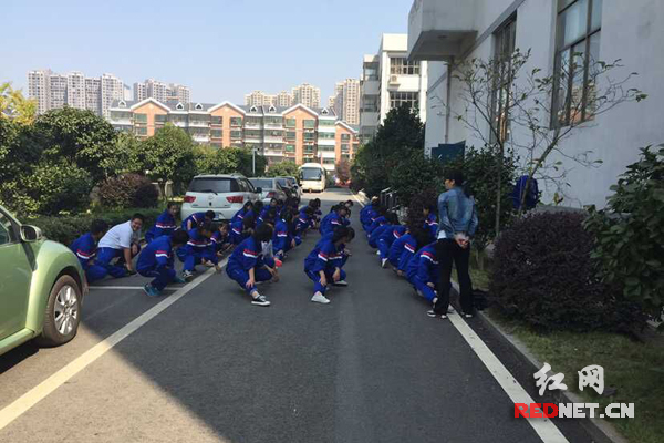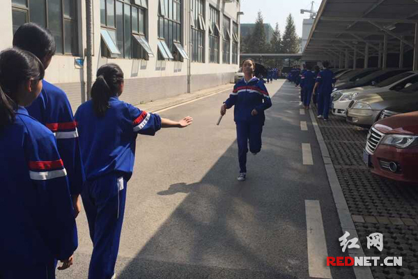 10月19日上午,记者来到雨花区职教城内的长沙财经学校,一进校区,便看到在马路上锻炼的学生们,一个班在训练50米接力跑,一个班在做课间操,马路边上停了不少车。
