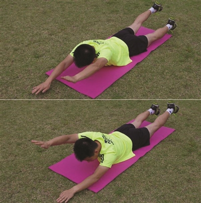 俯卧,双臂向前伸出;保持颈部与脊柱在同一直线上,抬起双脚、手臂,并使胸部离开地面;开始“游泳”,同时抬起对侧的手和脚(左手右脚或右手左脚),两侧交替进行。保持这种动作一分钟。