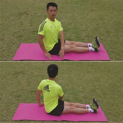 起始姿势:坐在地板上,向前伸直双腿;脊柱直立,以保持背部挺直;收腹,感觉向内拉紧肚脐,从右向左缓慢转动上半身,双手轻轻地碰触地面;保持上半身直立,反方向从左向右转动上半身,交替重复进行一分钟。