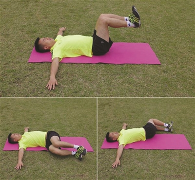 背部平躺,两臂向左右伸出,平齐于肩,看起来像锚一样;两腿抬起,并使双膝保持屈曲90度位;动用你的核心来控制,把双腿转向左边,在马上要碰到地面时停止;然后慢慢地把双腿拉回至起始位置,再向右边旋转放下双腿。两侧交替重复进行一分钟。