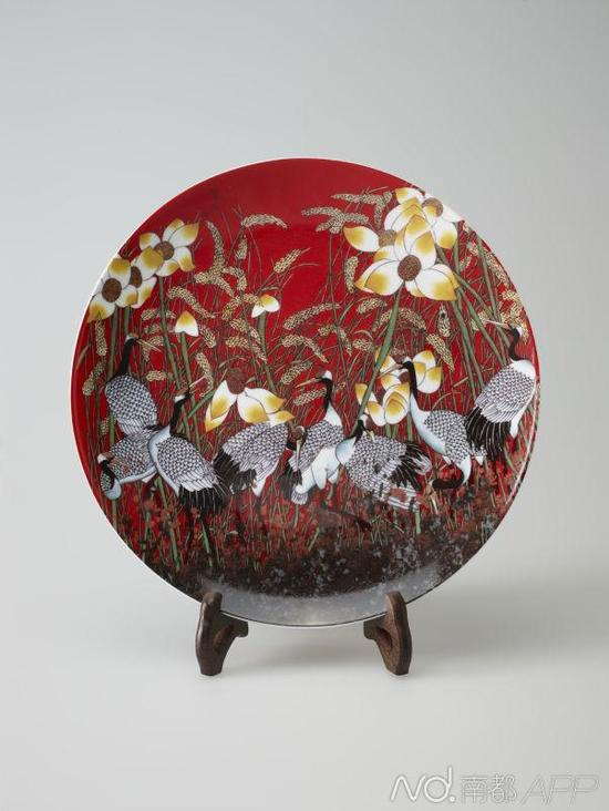 这个瓷盘也是在女王登基60周年的时候,由景德镇学校赠送给女王的。盘子上刻有仙鹤、稻谷和百合,寓意着年复一年的和谐。
