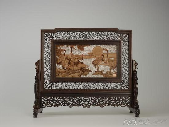 2002年,伊丽莎白女王二世登基50年,英国女王收到了这个雕刻檀木屏风,上面雕刻有仙鹤,仙鹤在中国文化中代表长寿。这个屏风由当时的中国国家主席江泽民赠送。