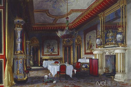 现在收藏在白金汉宫的很多中国艺术藏品都是在1840年从布莱顿的皇家馆中(Royal Pavilion at Brighton)转移过来的。这幅由詹姆斯•罗伯特(James Roberts,1800-1867)完成的水彩画,展现装饰着中国元素的装饰风格和中国样式的家具,这是间用于吃早饭的屋子。