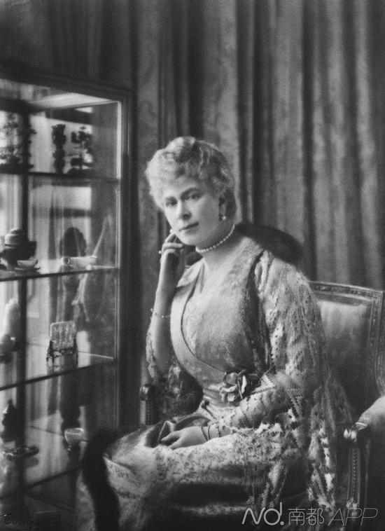 乔治五世之妻、玛丽王后对中国的艺术很感兴趣,在这幅照片中,她的边上有一个架子,架子上都是她收藏的玉器。