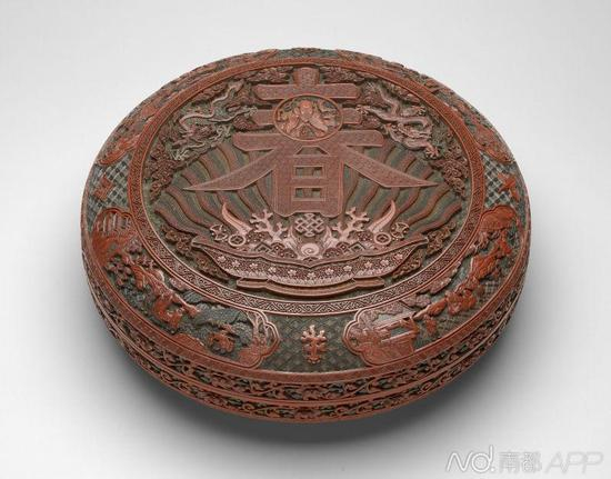 1793年到中国去的使团见证了乾隆皇帝赠送给乔治三世的这个礼物,这是一个红色的漆器盒子。印有一个大大的春字,寓意春日。