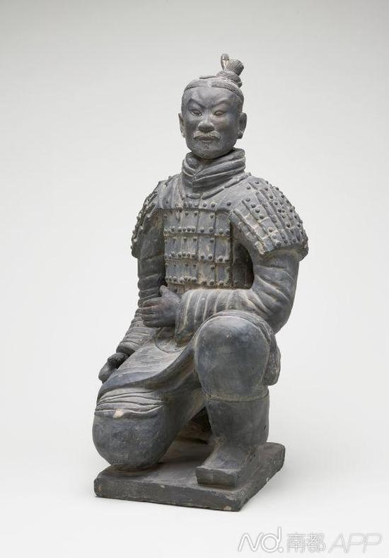 值得一提的是一英国尊单膝跪地的秦俑。根据王室官方网站介绍,这尊秦俑系1986英国女王伊丽莎白二世访华参观秦始皇陵时,时任陕西省省长李庆伟赠送给女王的。