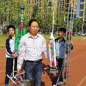 田老师说,多级水火箭成功克服了目前国内分级后气压逐渐变低不能最大距离发射的限制,理想射程可以达到500米以上,这样的成绩目前在全国乃至国际上都是领先的。研发多级水火箭时,除了通过网络查找资料外,他多次跑到东莞一个水火箭玩具厂,向厂家取经。研发水火箭烟花时,他还经常到醴陵的一些烟花厂了解烟花生产工艺、流程等。