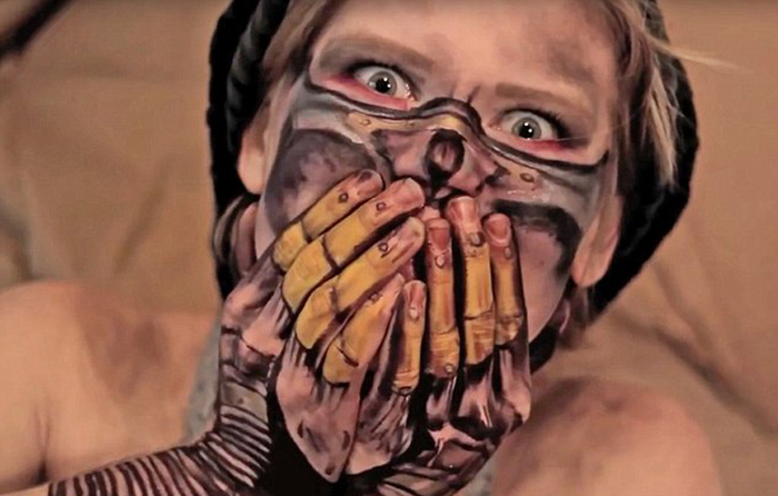 21岁的斯蒂尔利用人体彩绘技术将模特变成各种各样的超级英雄或恶棍,包括图中的“终结者”。(网页截图)