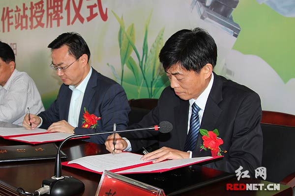 (湖南农业大学茶学博士科研工作站首席专家刘仲华教授[左]与益阳茶厂有限公司董事长彭雄根[右]签署了战略合作协议。)红网益阳10月22日讯(时刻新闻记者 刘怡斌 通讯员 叶青)10月22日,湖南农业大学茶学博士科研工作站正式落户湖南省益阳茶厂有限公司。仪式上,湖南农业大学茶学博士科研工作站首席专家刘仲华教授与益阳茶厂有限公司董事长彭雄根签署了战略合作协议。