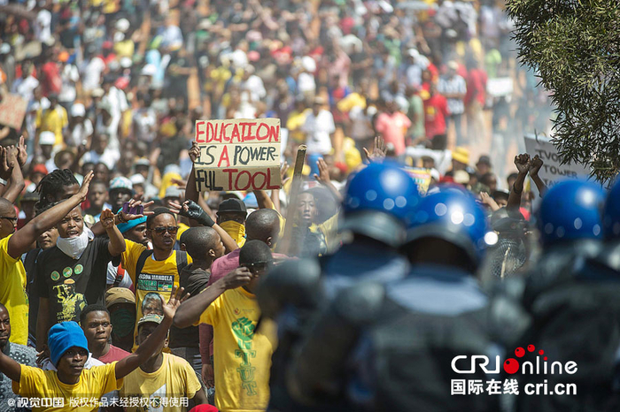 国际在线消息:当地时间2015年10月23日,南非比勒陀利亚数千南非学生持续抗议大学学费上涨。图片来源:CFP