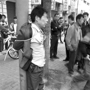 男子跟踪骚扰女初中生 被家长绑灯柱示众(图)