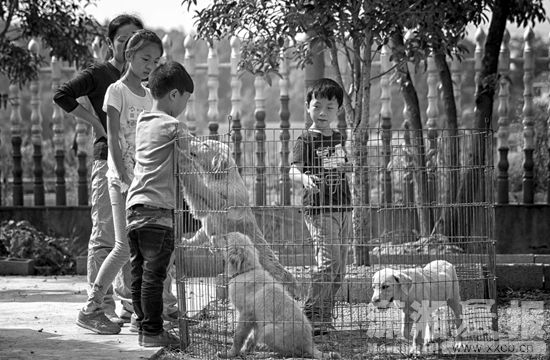 10月25日上午,在狼道训犬基地,二十几位小朋友正争先恐后地排着队要摸一摸一只可爱的拉布拉多犬。排在第一位的,是12岁的李哲宇,刚掌握技巧的他摸着小狗的手还有些不知所措,生怕摸重了,会让狗狗感到疼痛。