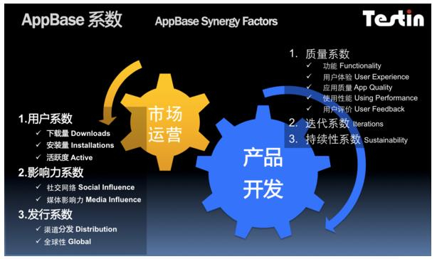 AppBase实力象限(Testin AppBase Synergy Quadrant) 根据移动App市场运营、产品开发这两个重要属性的14项维度进行分类分析,提供了化繁为简的App实力市场、运营、产品、研发的提升决策方法(App Synergy Factors Decision Tools),以便精确发现App开发者最为困惑的发展策略问题中所存在的问题,以客观的决策依据评估一个App相对其垂直领域内的同类型App的综合实力、以至相对于任何一个App的竞争态势,制定产品开发、市场运营均衡的发展策略,用来判断投入产出效果的总体影响、投资回报等静态比较和变化趋势,最终建立长期、持续的实力,同时向行业人士和投资人提供了用来评判App的综合协同发展潜力的依据。