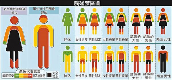 【环球网综合报道】握手、拍肩膀和拥抱等身体接触,往往被视为表达善意和拉近距离的做法,但并非所有人都喜欢被他人触碰。据香港《文汇报》10月28日报道,牛津大学研究员近日制作出一张触碰图表,分析男女喜欢和不喜欢被碰的部位。该结果反映,与对方关系愈亲密,则可接受触碰的部位便愈多;令人意外的是,男性愿意让陌生女性触摸身体任何部位,相反,对陌生男性则是除了手部以外几乎全是“禁区”。