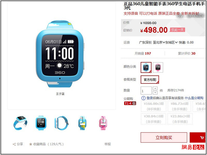 360儿童智能手表儿童三代的基本定价在499元,有两种颜色可以选择,天蓝和粉红,定价上来说,基本上定位在相对中低价款式的儿童手表区间。