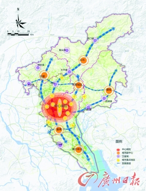 东部城区-南沙新区发展轴:东部城区经中心城区至大学城-南沙新区,沿城市交通干线、蕉门水道串联的发展轴。