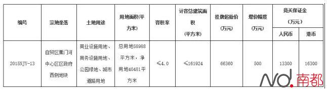 本次出让的自贸区蕉门河中心区区政府西侧2015NJY-13地块,总用地58988平,计容建筑面积≤161924平。起拍价为6.636亿元,折合楼面价3481元/平,将在12月3日开拍。