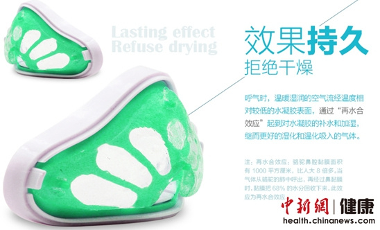 霾星人鼻用空气加湿器内部采用再水合原理,以确保加湿效果的持久性。何为再水合?骆驼的鼻腔黏膜面积有1000平面厘米,比人类的大8倍多。当气体从骆驼的肺中呼出,再度经过鼻黏膜时,黏膜把68%的水分回收下来,此效应称之为“再水合”。而在佩戴霾星人鼻用空气加湿器时,人体呼出的温暖湿润的气体流经温度相对较低的水凝胶表面,通过“再水合”对水凝胶进行补水和加湿,继而持久地对吸入的空气进行温化湿化处理,实现长效加湿。