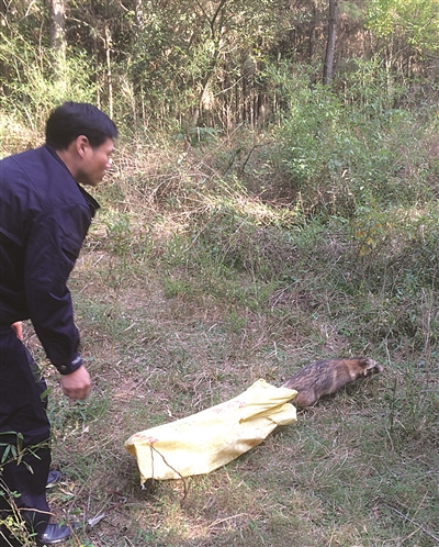 民警拨通了溧水区农业局的电话。通过现场观察和比对,农业局农技站的专家最终确定这只神秘动物是只“貉”,也就是大家熟悉的成语“一丘之貉”里的那个“貉”。这家伙是江苏省重点保护动物,也是国家三级保护动物。据介绍,野生貉喜欢在河流、湖边以及草丛活动,并以树漏、石缝为居,喜欢吃鱼虾、兔等。近年来随着野外原生态环境的变化,这种野生动物也是越来越稀少了。大伙觉得既然是保护动物,就应该让它回归自然。在确定其腿部夹伤只是轻伤,不影响正常生活的情况下,民警和农业部门相关工作人员一起,已将这只“貉”放归了溧水区白马镇回峰山。
